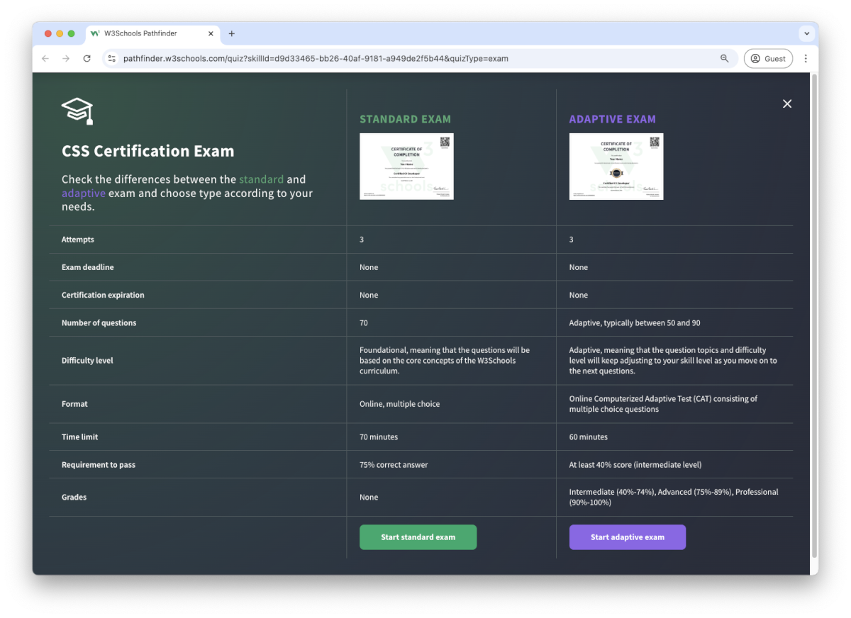 The CSS exam is a test that summarizes the W3Schools CSS syllabus.