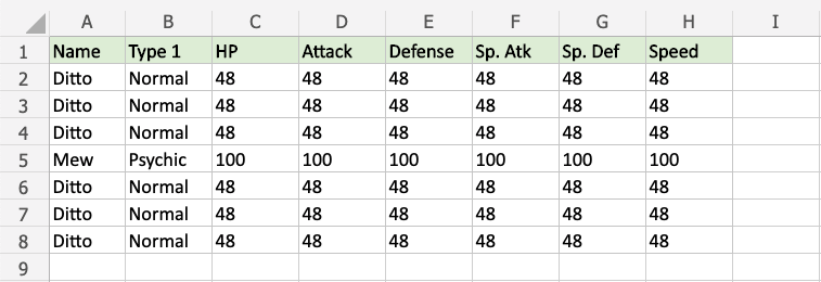 All of Ditto's stat values are 48 and all of Mew's stat values are 100, so they are all highlighted.