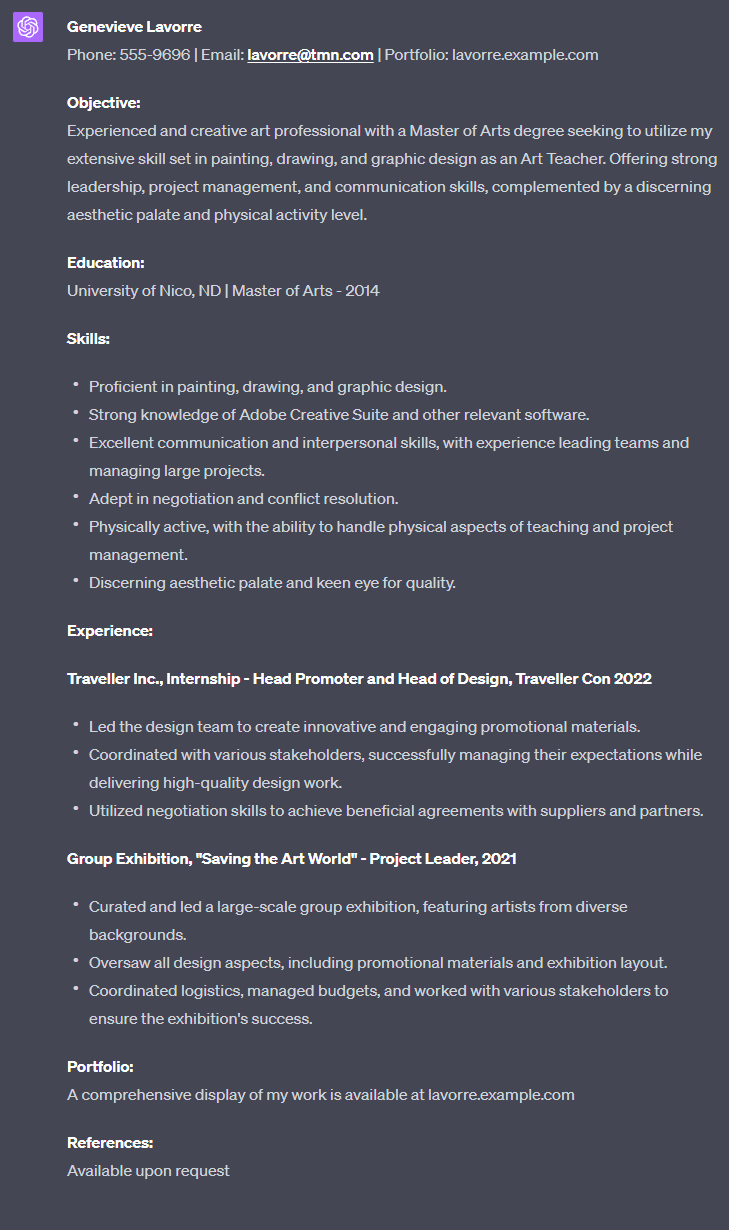 Create a resume for me, Genevieve Lavorre. Graduated in 2014 from the University of Nico, ND, with a master's degree in arts. Completed an extensive internship with Traveller Inc., where I was the head promoter and head of design for Traveller Con 2022. In addition, I led a large Group Exhibition called "Saving the art world" in 2021. Can you create a new resume emphasizing my education, skills, and experience? I am trained and proficient in painting, drawing, and graphical design. My portfolio is available at lavorre.example.com . Contact information: E-mail: [email protected], Phone: 555-9696. I also have experience with tough negotiations, am physically active, and have a discerning palate. I am looking for a job as a teacher. If you need any more information to continue, ask.