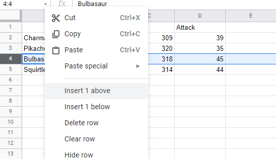Rows can also be added and deleted. You access the menu by right clicking the row number and clicking on Insert 1 below or Insert 1 above.