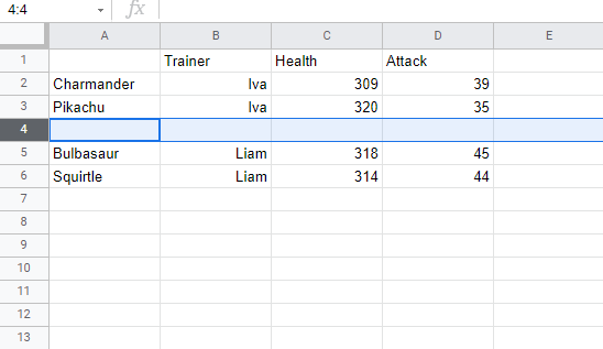 We forgot to add Iva's Pokemon, Marowak. Lets add Marowak's data to the new row 4, by typing or copying the following values: