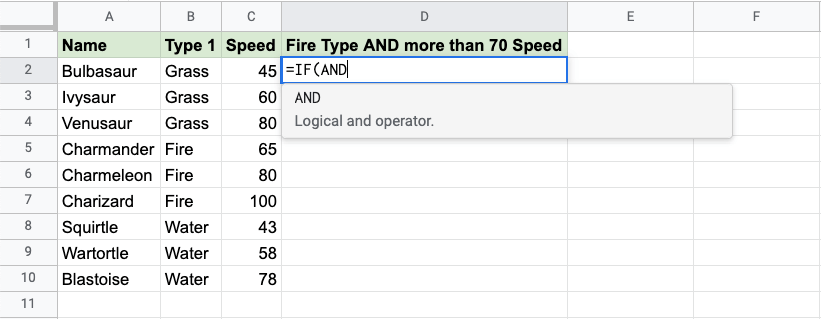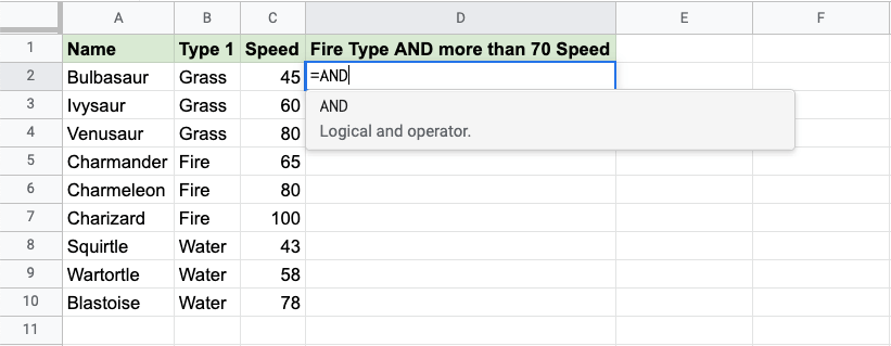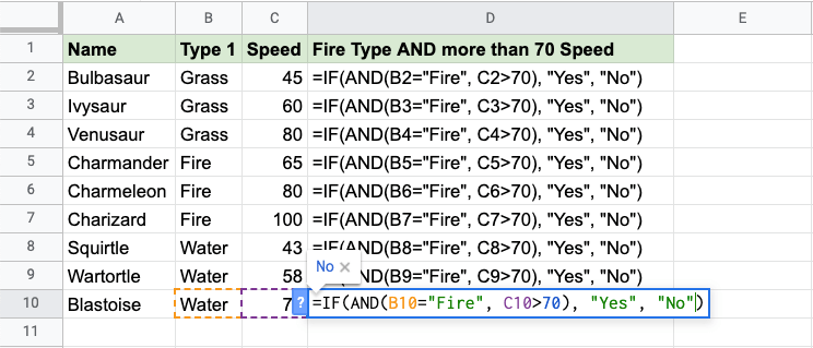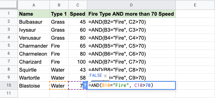 Now each row has a check for both being Fire type and Speed greater than 70: