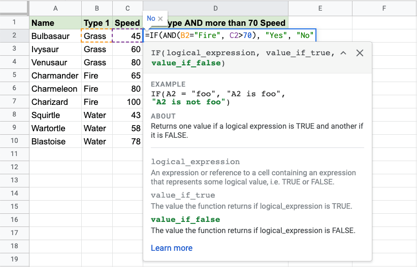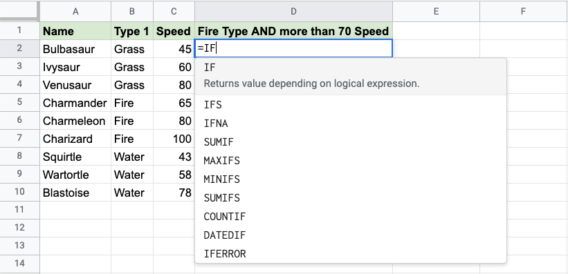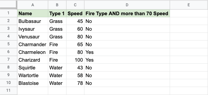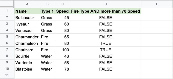 Now, each row has a check for Fire Type and Speed greater than 70: