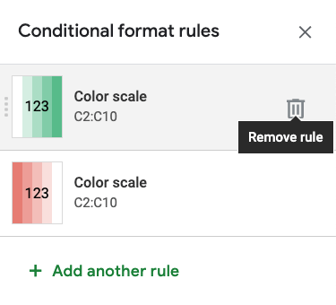 Rules can also be removed in the right-hand side Conditional format rules menu.