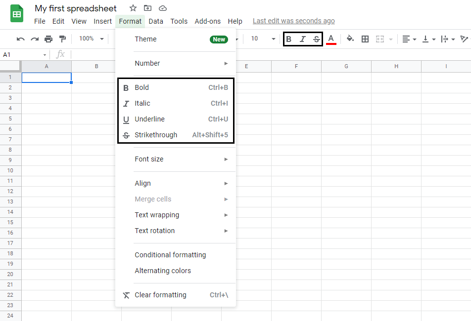 Underline is applied by either clicking the Underline () option in the Format menu or using the keyboard shortcut Ctrl+U or Command+U
