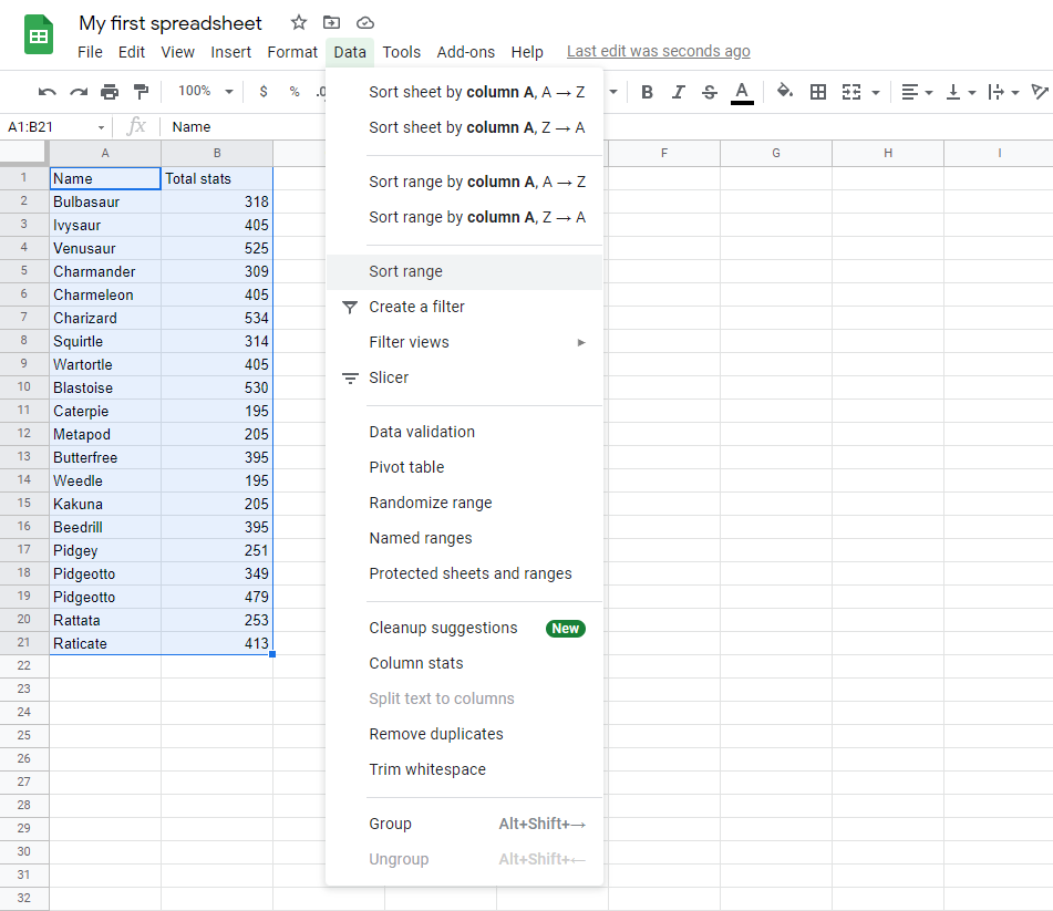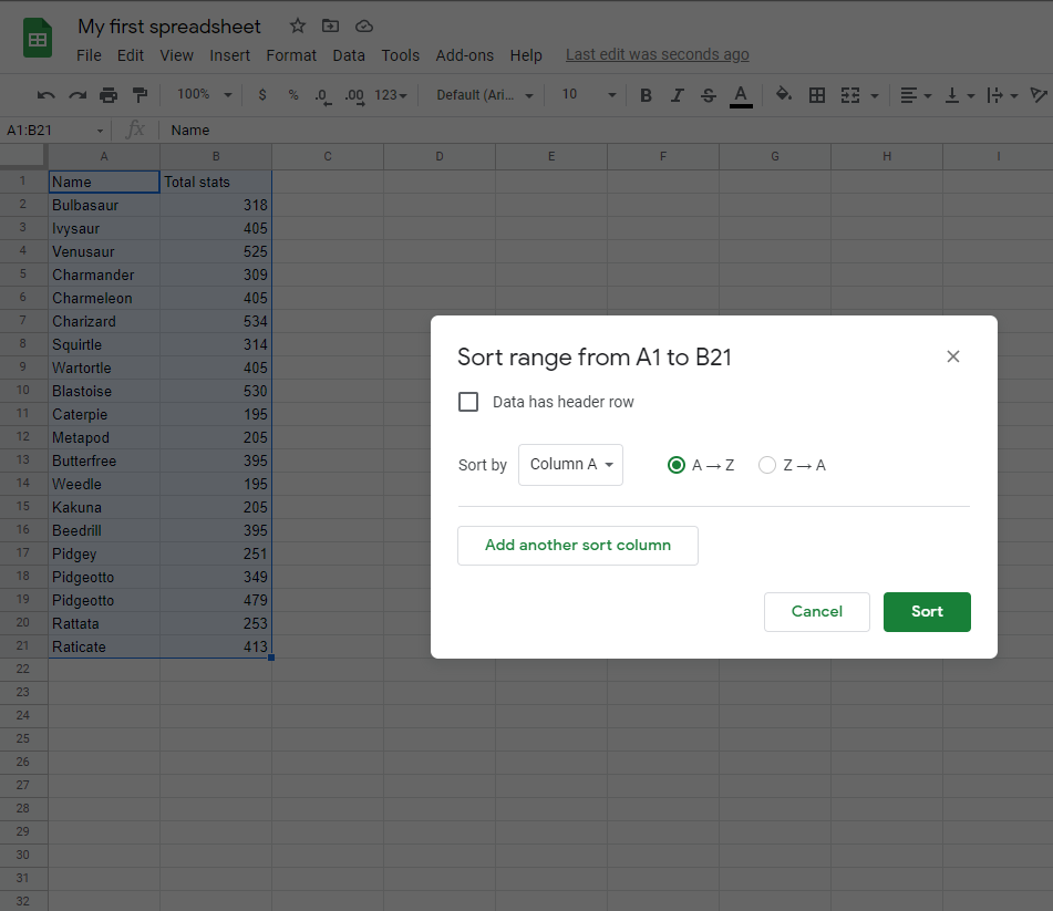 Sort the Pokemon in the range A2:A21 by their Total stats, ascending from smallest to largest (A-Z) and then sort the results based on their Name.