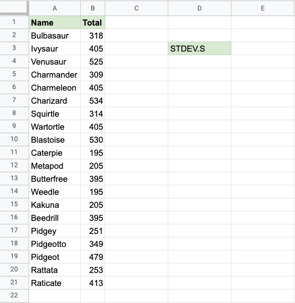 Now, the function returns the standard deviation of all the Total stat values: