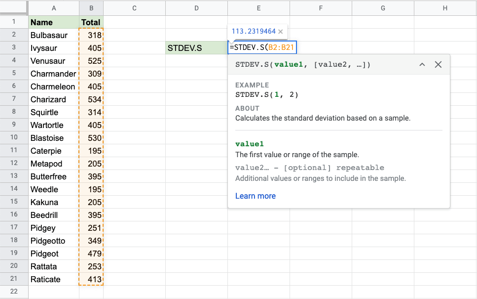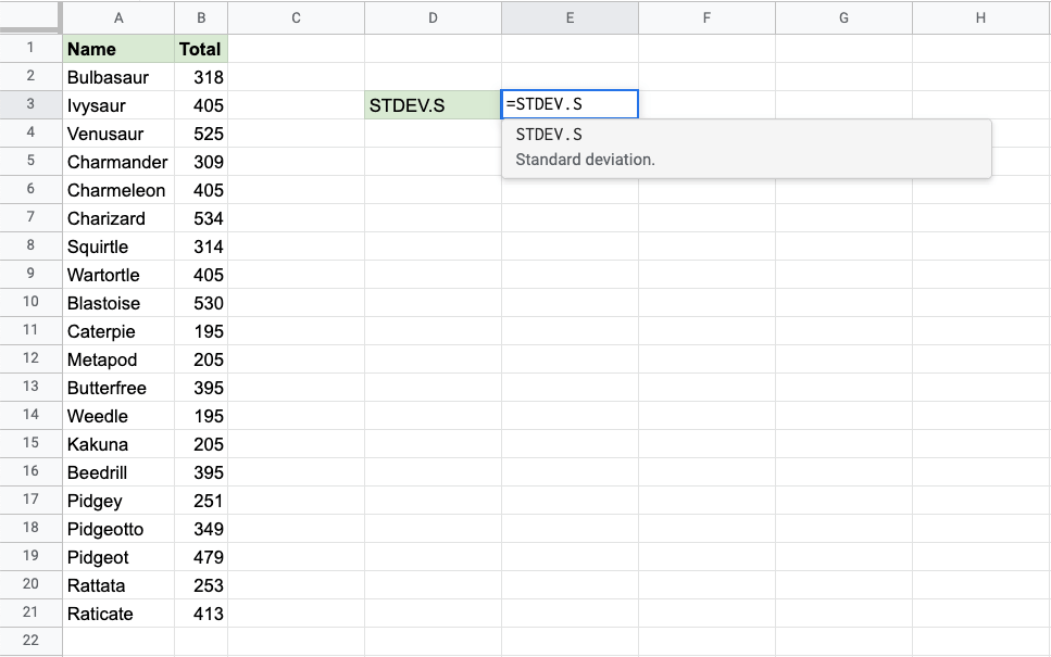 Google Sheets STDEV.S Function