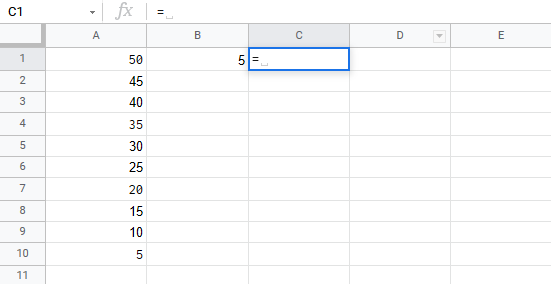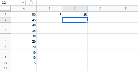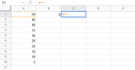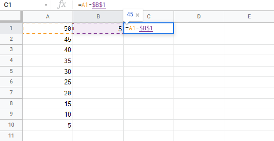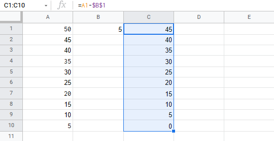 Let's have a look at an example where we subtract B1(5) from the range A1:A10 using absolute reference and the fill function.
