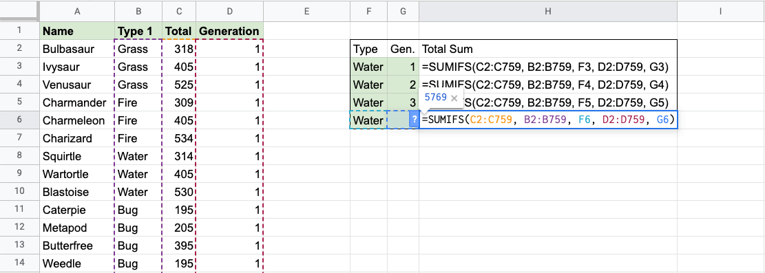 The function now calculates the sum of total stats for the 1st Generation Water type Pokemon.