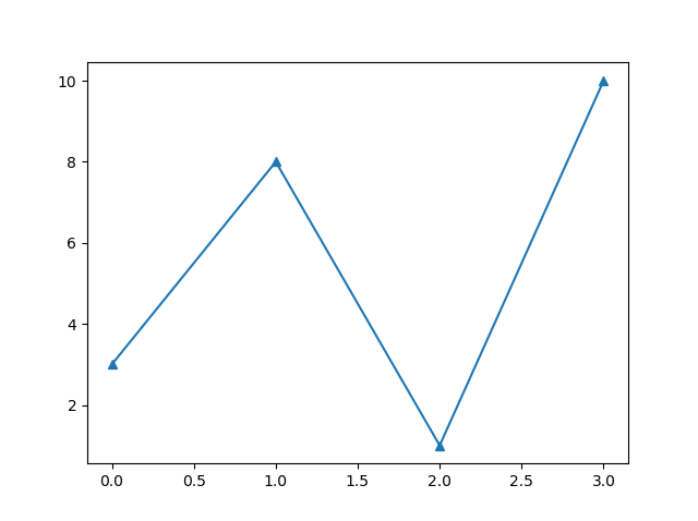 #Three lines to make our compiler able to draw: import sys import matplotlib matplotlib.use('Agg') import matplotlib.pyplot as plt import numpy as np ypoints = np.array([3, 8, 1, 10]) plt.plot(ypoints, marker = '^') plt.show() #Two lines to make our compiler able to draw: plt.savefig(sys.stdout.buffer) sys.stdout.flush()